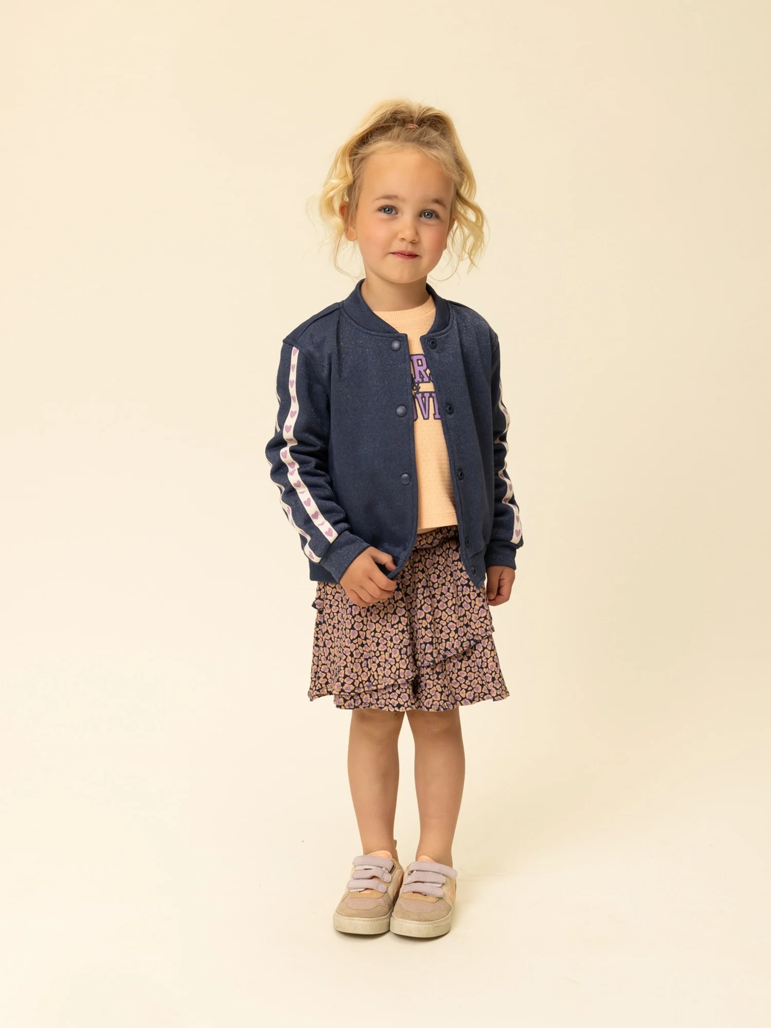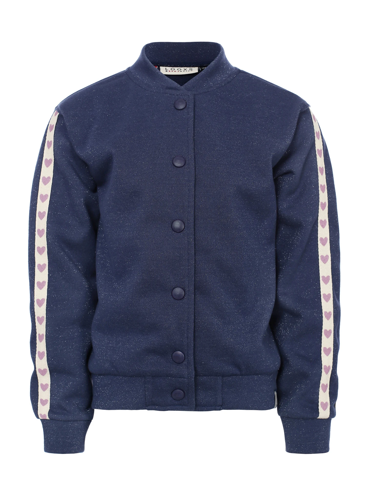 Het kinderkleding vest sluit met handige drukkers aan de voorkant en heeft een ronde hals, normale lengte en een normal tot loose fit pasvorm. De mouwen zijn afgewerkt met een fancy hartjes tape, wat zorgt voor een speelse en girly touch. Op de achterkant zit een opvallend borduur artwork met de tekst “University of Love”, waarmee dit Looxs Little vest echt opvalt.