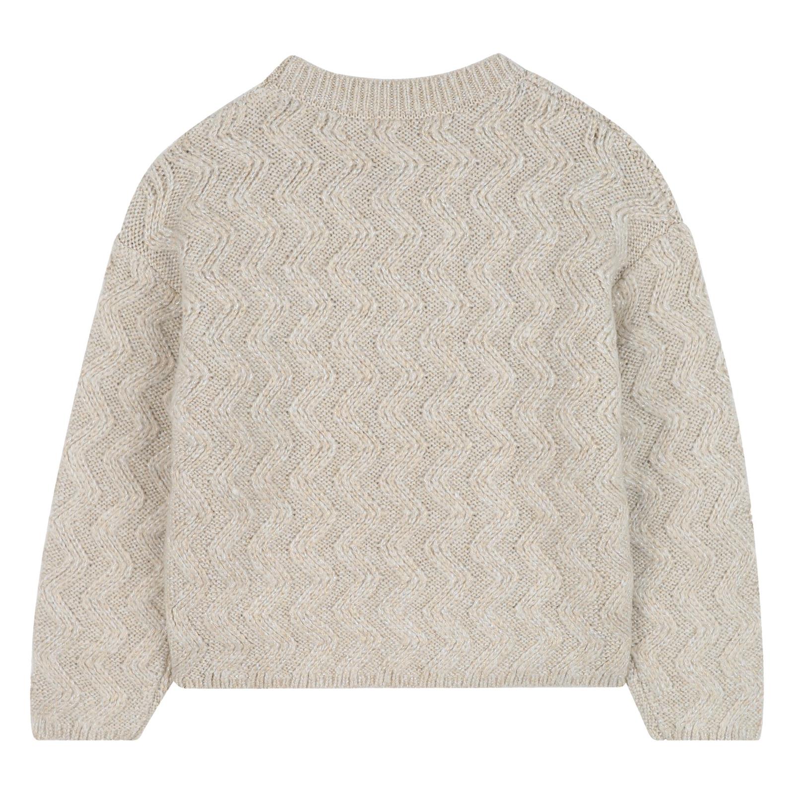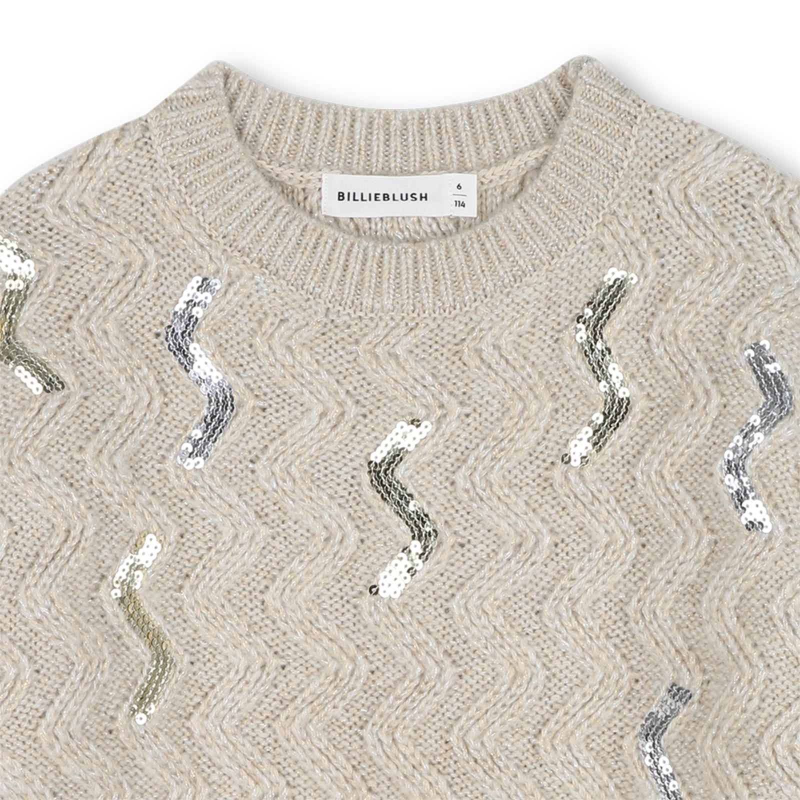 Deze prachtige Billieblush meisjestrui combineert comfort met een vleugje glamour. De trui is uitgevoerd in een zachte beige tint en heeft een subtiel chevron-breipatroon dat zorgt voor een luxueuze uitstraling. Aan de voorkant schitteren golvende paillettenapplicaties in zilver- en goudtinten, die het design een feestelijke en speelse twist geven.