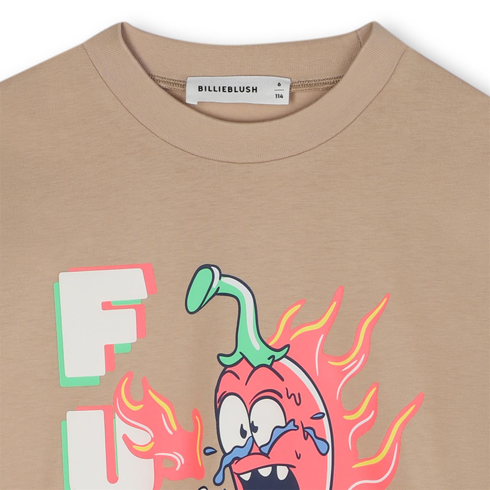 Laat zien dat mode en plezier perfect samengaan met deze Billieblush jongens longsleeve met een stoere chilipeperprint! Het shirt is uitgevoerd in een trendy beige tint en versierd met een vrolijke, kleurrijke opdruk van een cartoon-chilipeper in vlammen, naast de grote letters “FUN”. Een echte eyecatcher die de speelse stijl van Billieblush perfect weergeeft.