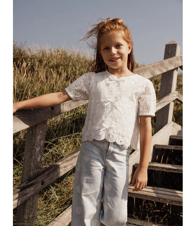 De blouse broderie anglaise wit van Looxs Little is een tijdloze en romantische toevoeging aan iedere meisjesgarderobe. Deze zomerse blouse straalt pure zachtheid en verfijning uit dankzij de prachtige broderie anglaise stof in een frisse, uni witte kleur. Een echte klassieker met een moderne, girly twist.