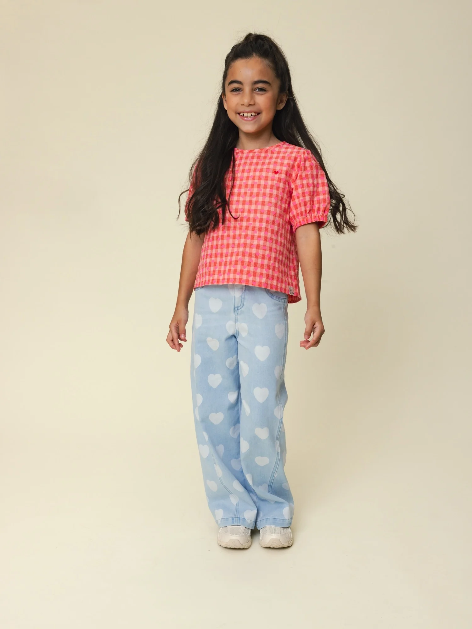 Follow your heart met deze Denim Wide Leg Hearts meisjes jeans van Looxs Little. Deze trendy meisjesbroek combineert een stoere denim look met een speels en vrolijk all-over hartjes dessin, waardoor hij direct opvalt. De gebleekte denim wassing geeft de broek een moderne uitstraling die perfect past bij het huidige modebeeld voor kinderen.