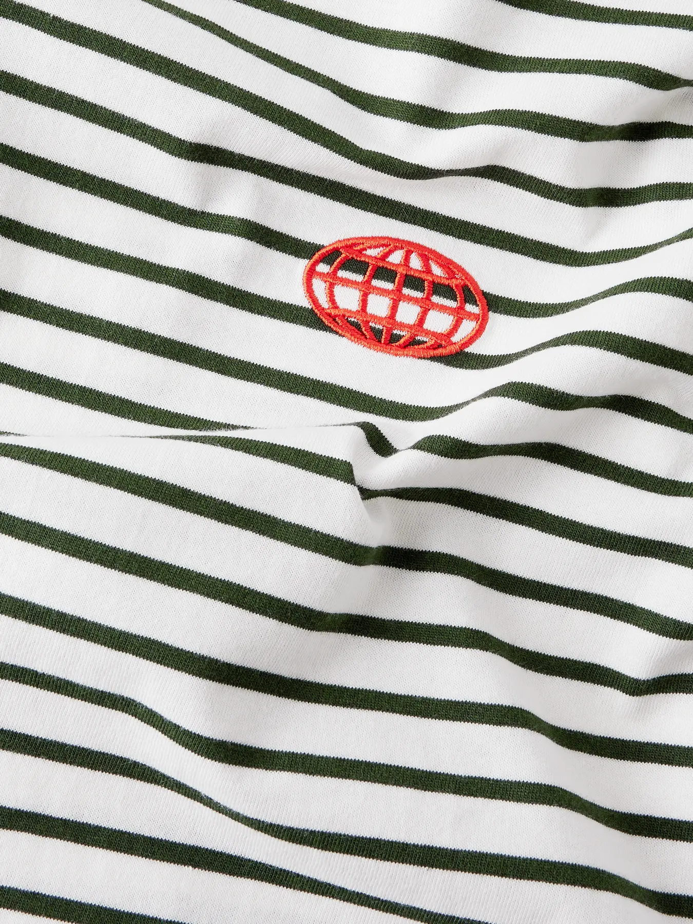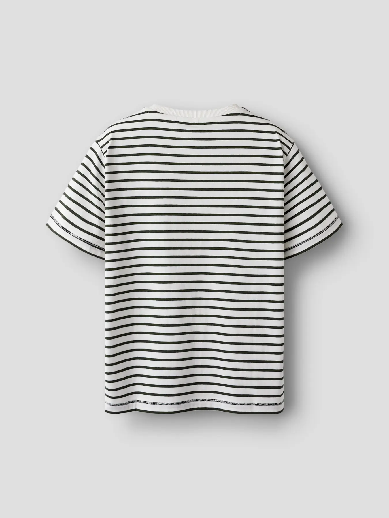 Op zoek naar een stijlvol en comfortabel kinder T-shirt? Dit wit met zwart gestreepte T-shirt met een subtiel rood globe-logo op de borst is de perfecte combinatie van mode en comfort. Het tijdloze streeppatroon maakt dit shirt makkelijk te combineren en geschikt voor elke gelegenheid – van schooldagen tot familie-uitjes. Dit T-shirt is ook van het merk Name It.