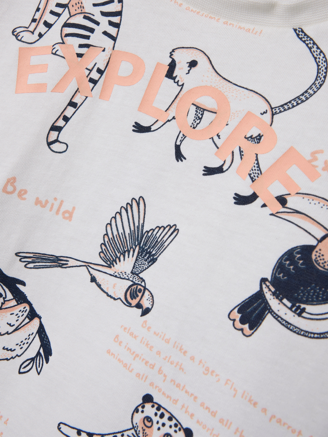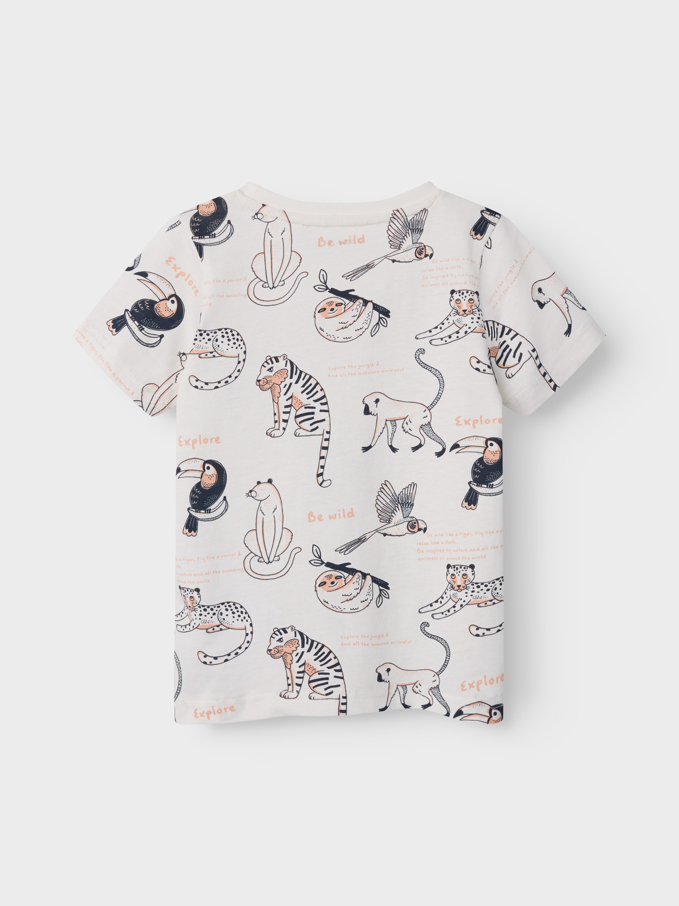 De witte basis wordt verlevendigd door een all-over jungleprint met wilde dieren zoals tijgers, apen, toekans en luiaards. De vrolijke teksten “Be Wild” en “Explore” geven het shirt een avontuurlijke uitstraling. Dankzij de ronde hals en korte mouwen heeft dit T-shirt een comfortabele pasvorm met veel bewegingsvrijheid.