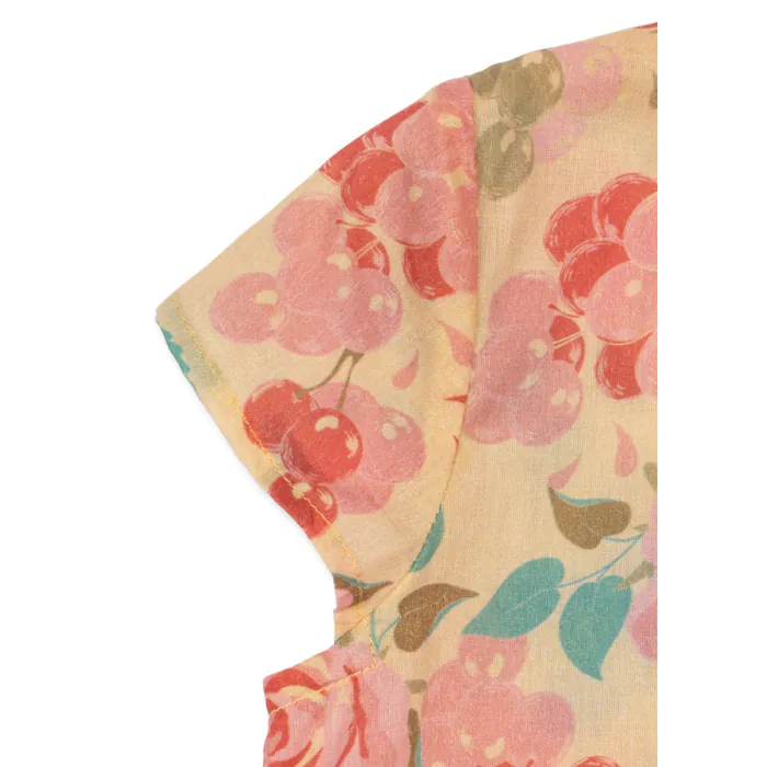 De bloomiegrape print toont een rijk spel van bloemen en bessen in roze en blauwe nuances op een zachte beige basis. De korte mouwen en de subtiele knoopsluiting aan de voorzijde geven de jurk een klassieke en verzorgde uitstraling. De taille is licht gerimpeld waardoor de rok soepel valt en elegant meebeweegt. Deze meisjes jurk heeft een tijdloos silhouet dat verfijning en speelsheid in balans brengt.