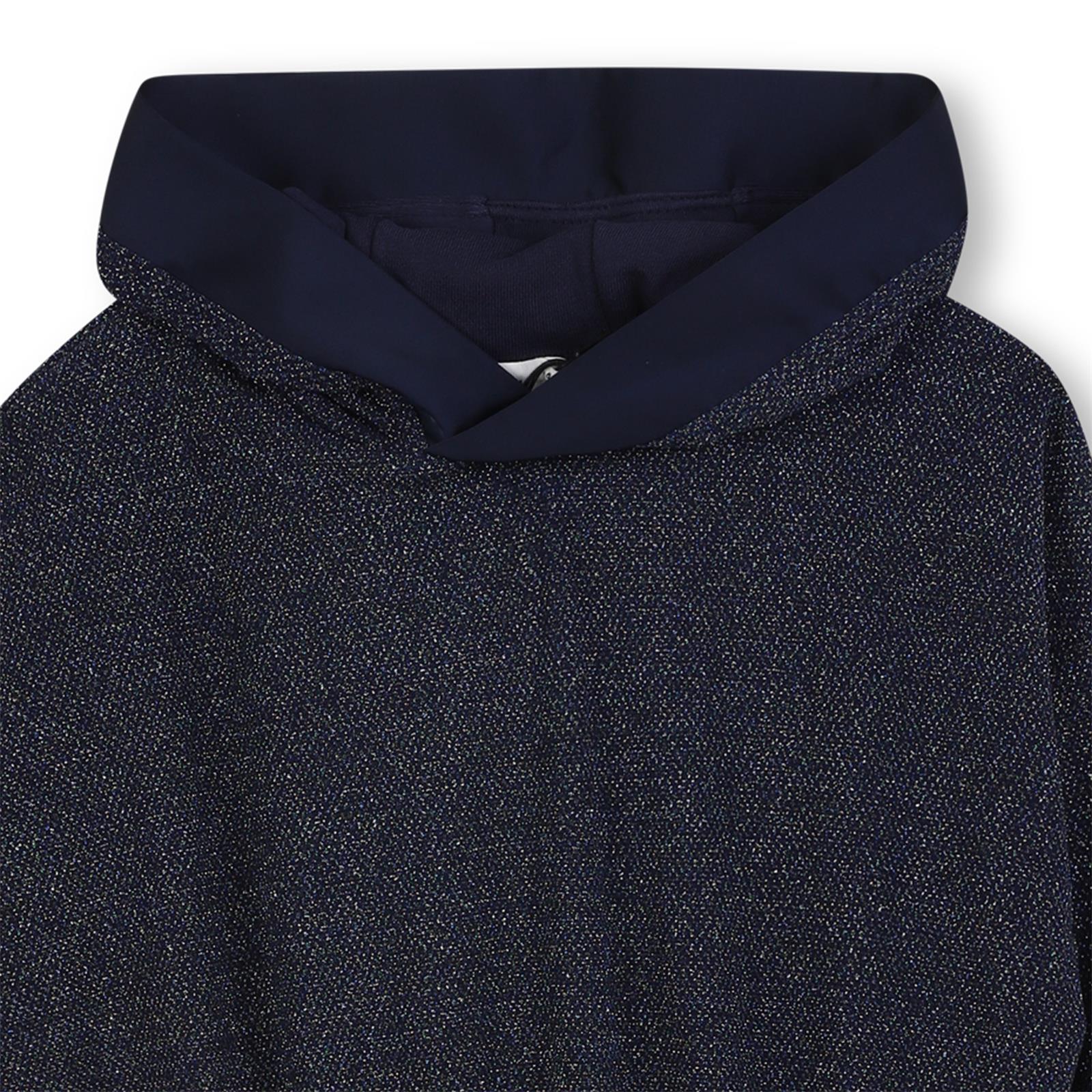 Deze Billieblush meisjes glitterjurk met capuchon combineert stijl, comfort en een vleugje glamour in één trendy item. De jurk is uitgevoerd in een diep donkerblauwe tint met een subtiele glans dankzij het fijngebreide metallic garen. De capuchon geeft de jurk een sportieve twist, terwijl de elastische taille zorgt voor een mooie pasvorm en extra draagcomfort.
