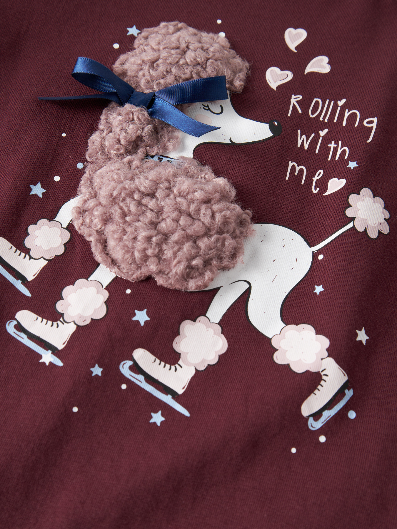 De longsleeve valt op door de vrolijke poedelprint op rolschaatsen, afgewerkt met een 3D fluffy detail en een satijnen strik – een speelse en stijlvolle combinatie die elk meisje geweldig zal vinden. De tekst “Rolling with me” maakt het geheel extra fun en eigentijds.