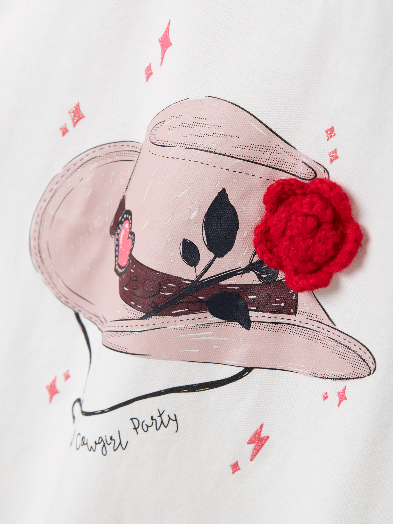De witte basis maakt dit shirt makkelijk te combineren, terwijl de cowboyhoed-print met rode 3D bloem zorgt voor een vrolijke, speelse uitstraling. De subtiele glitters en de tekst “Cowgirl Party” geven het T-shirt een extra girly touch.