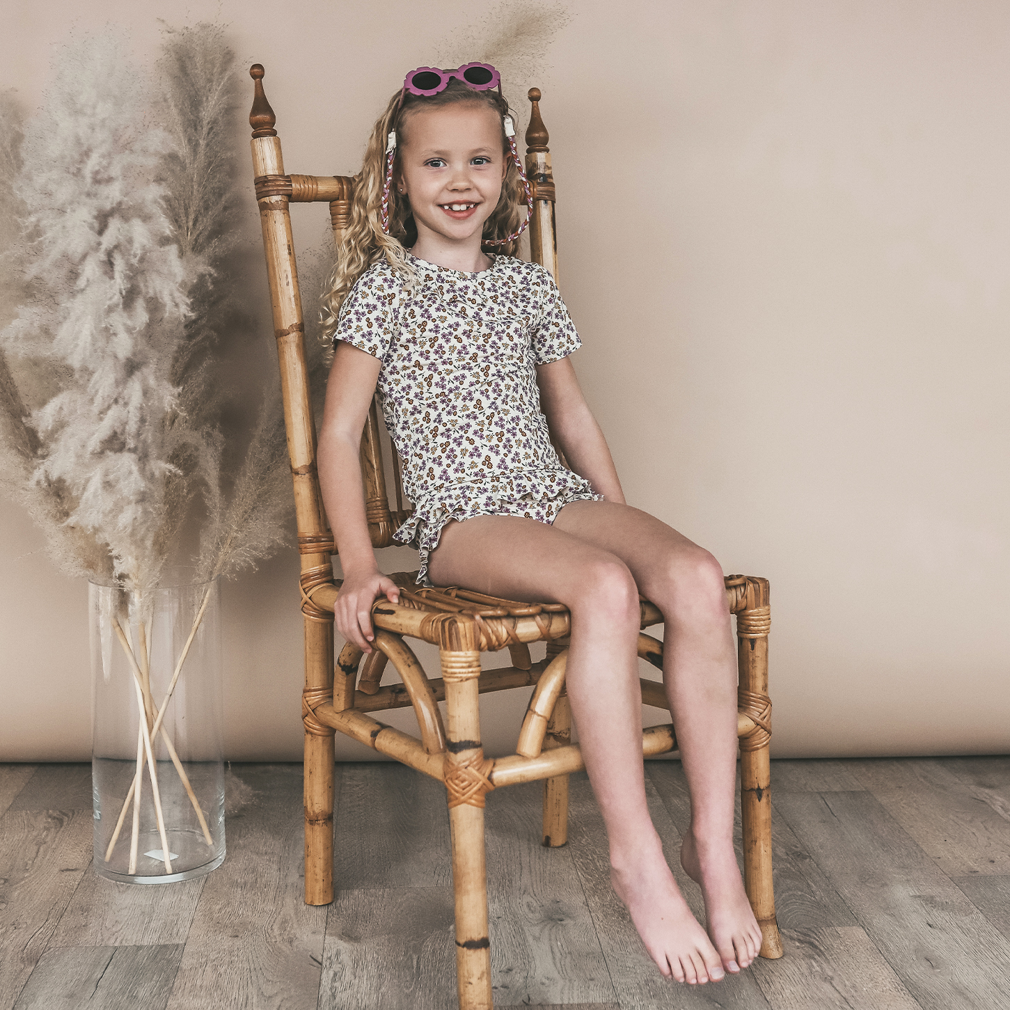 Set van Salted Stories in Bombay Brown uit de Sparkly Flower-lijn. Comfortabele set voor meisjes, ideaal voor strand en zwembad. Materiaal: 77% Polyamide, 13% Metallic, 10% Elastaan.