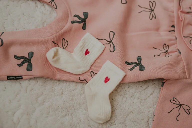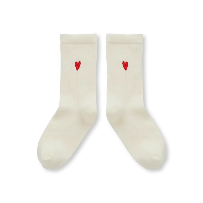 De ivory sportsokken met hartje zijn een perfecte combinatie van comfort en stijl. Deze sokken hebben een zachte ivoorwitte kleur en zijn afgewerkt met een subtiel rood hart borduursel net boven de enkel. Een klein detail dat zorgt voor een speelse en liefdevolle uitstraling. Perfect te combineren met outfits van Sproet & Sprout.